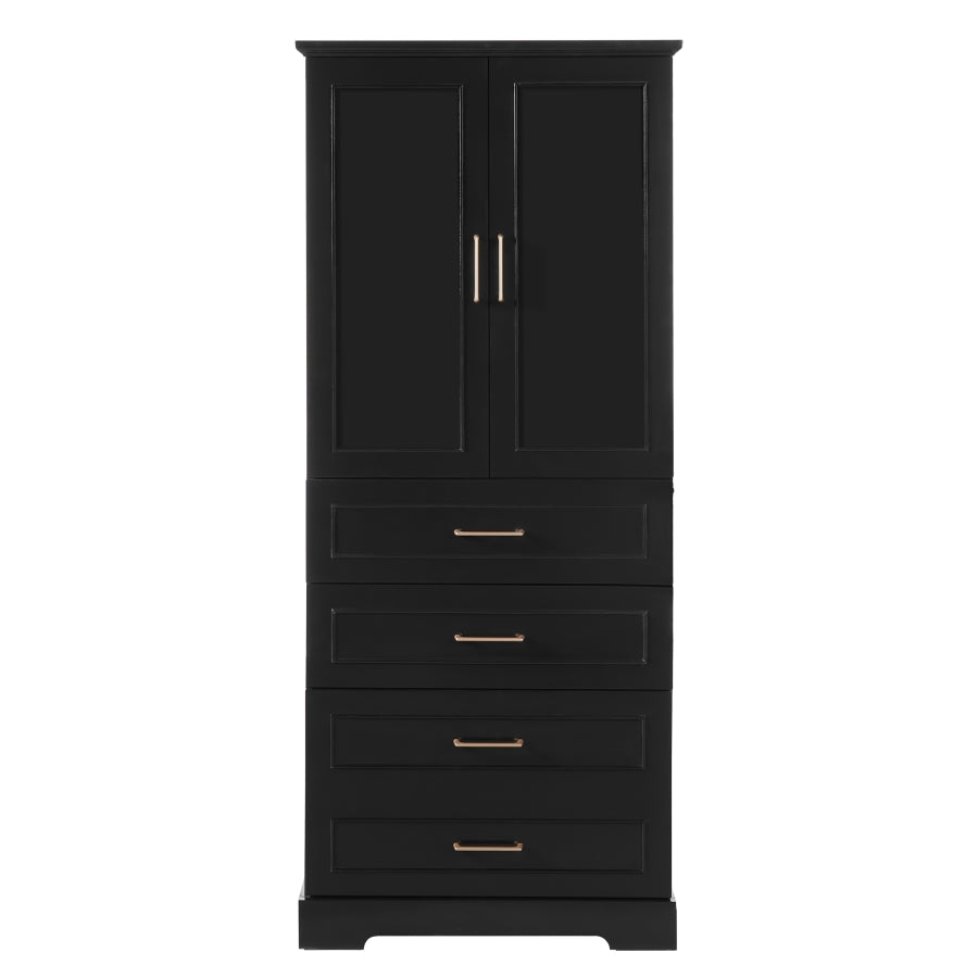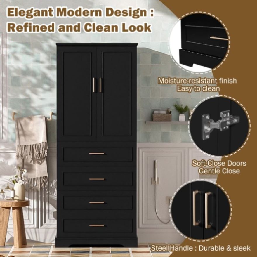 This tall bathroom cabinet features three drawers—partitioned, standard, and deep—for storing items of different sizes. Behind the soft-close doors, one fixed and one adjustable shelf provide additional space for towels, toiletries, and household supplies. With a well-organized layout, this cabinet supports efficient bathroom storage.