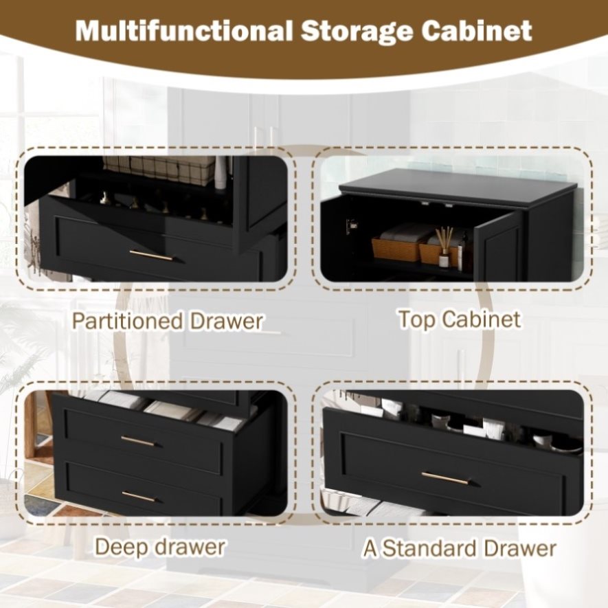 Smart Storage Layout:Features a partitioned drawer, a standard drawer, a deep drawer, and a double-door cabinet with one fixed and one adjustable shelf—offering layered storage to accommodate various bathroom items.