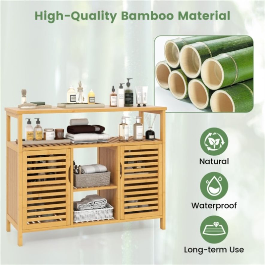 ● Ample Storage Space: The bamboo bathroom cabinet features a spacious top surface, versatile shelving options, and 2 generously-sized enclosed cabinets. Ideal for storing towels, toiletries, and other essentials, it keeps your space tidy and organized.
