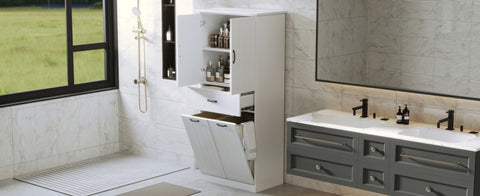 1. High-quality MDF Board & Painted Finish 2. Cabinet with Doors & One Drawer & Laundry Basket 3. Applicable for Bathroom or Laundry Room Details 1. Cloth Bags 2. Adjustable Shelf 3. Metal Black Handles 4. Soft Close Hinges 5. Anti-tipping Device