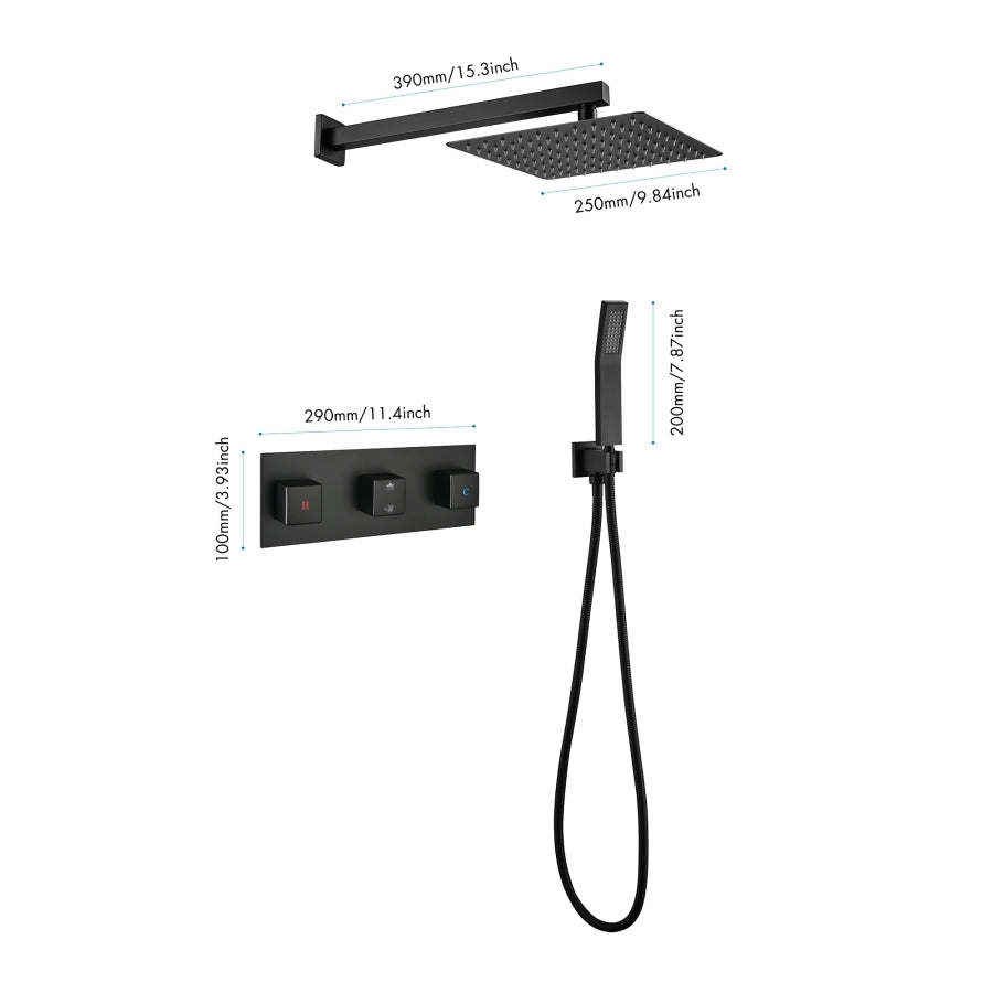 Package Includes: Wall mounted shower faucet set includes 10-inch rain shower head with handheld sprayer and 59-inch hose, brass shower mixer valve, brass handheld.