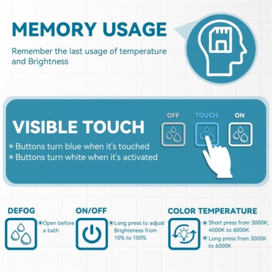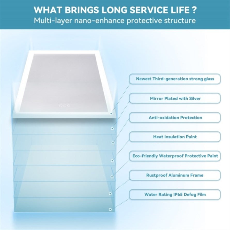 [Double Protection]Silver-sand sprayed aluminum frame, galvanized metal backboard water rating IP44 protects the LED light. It will prevent the components inside corrosion and prevent mirror deformation in humid environments, which makes it a longer service life.