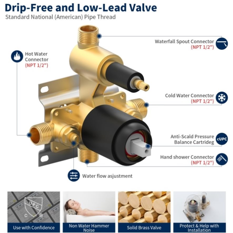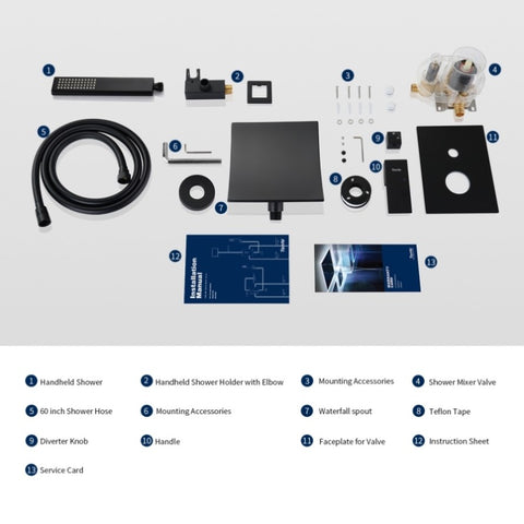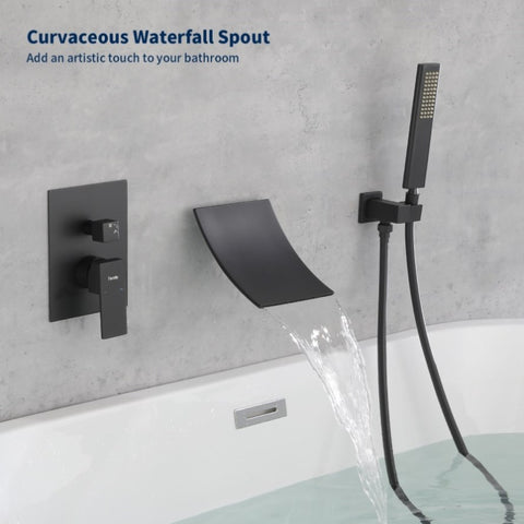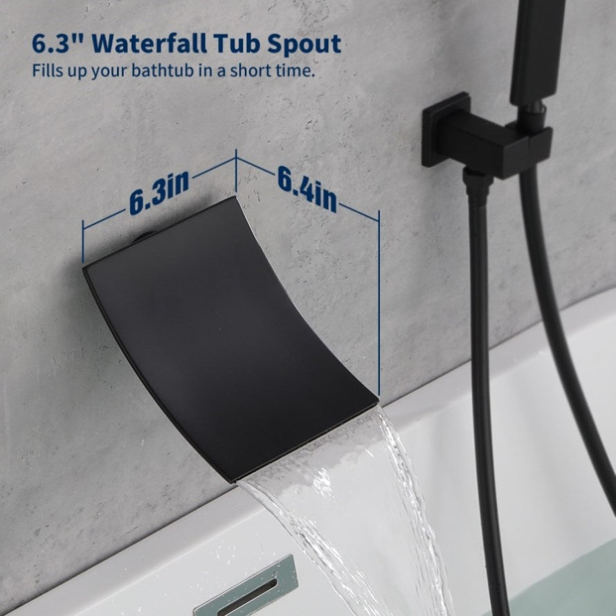 Color Matte Black - 6.1" Curved Spout Material Brass, Stainless Steel and PVC Finish Type Matte Black Number of Handles 1 Handle Material Metal Mounting Type Wall-Mounted Included Components 1/2 NPT Spout Reach 6.34 Inches Flow Rate Description After flow testing, the spout flow rate can reach 13.2GPM at 0.3mpa, Shower sprayer flow rate is 2.0 GPM / 7.6 LPM Part Number WC004B2S-W Item Weight 11.33 pounds Product Dimensions 12 x 15 x 6 inches Item model number WC004B2S-W Size Waterfall Tub Faucet Color Matte Black - 6.1" Curved Spout Style Matte Black Tub Faucet Finish Matte Black Shape Square Installation Method Wall-Mounted Usage Wall mount waterfall tub faucet with hand shower for bathtub Batteries Included? No Batteries Required? No