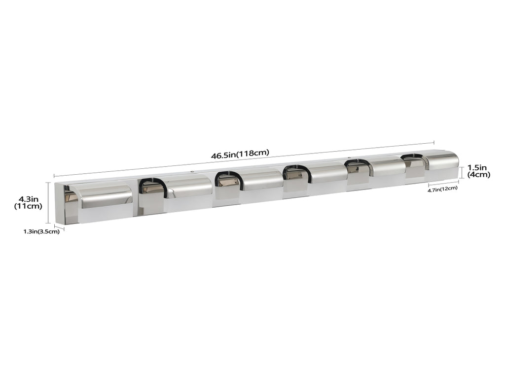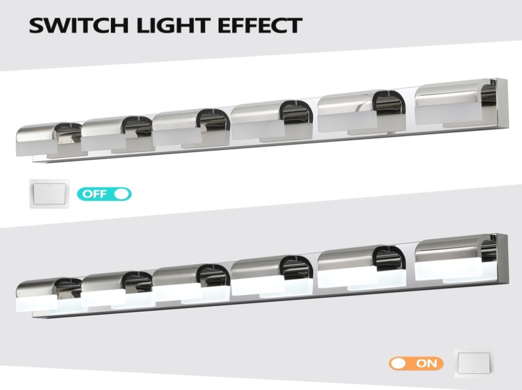 Material: Stainless Steel & Acrylic Color: Chrome Light source type: LED Number of lamp holders: 6 Brightness adjustment: Support dimming (Please self-equipped dimmer) Applicable space: bathroom, dressing room, etc Installation mode: wall hanging Power Supply Mode:Hard-Wired CRI:85 Lumen:1950 Color Temperature:6000K Wattage: 30 Watts Voltage: 100-120V