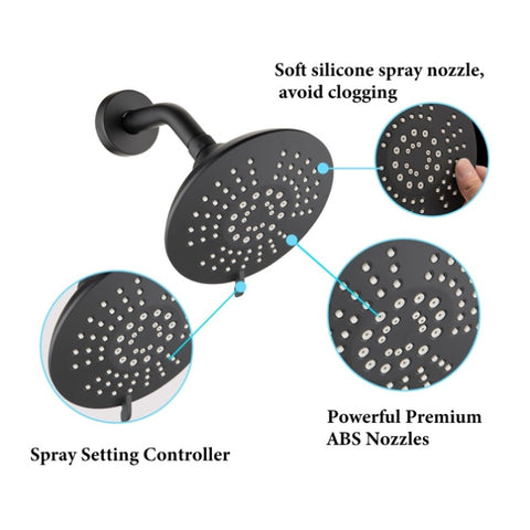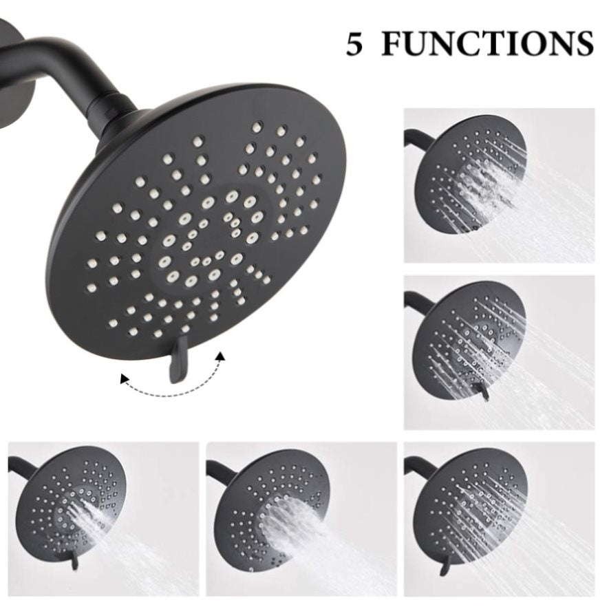 Shower faucet has 6" round shower head, which includes 5 different spray types. You can immerse yourself in five spray types: stable, powerful, soft or etc. To satisfy all of your showering needs.