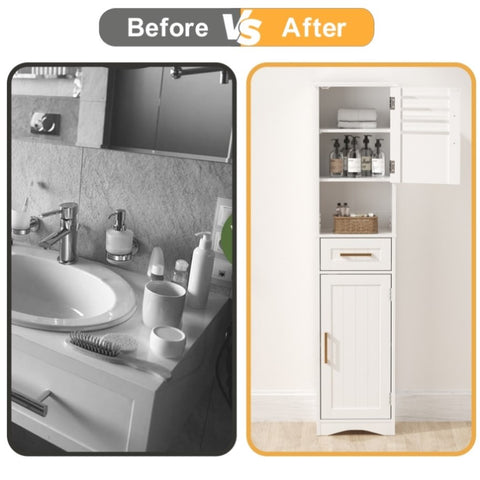 Tall bathroom storage cabinet is equipped with two storage cabinet and a spacious drawer, which can provide plenty of storage space for your hairdryer, towels, cosmetics and toiletries;
