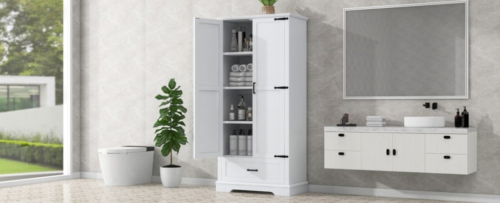 Ample Storage: Upper enclosed cabinet with doors has four tiers to accommodate decorations or articles for daily use. As for lower part, there are one big drawer to provide more storage space.You can put stuff in it, such as shampoo, towel, body lotion, tissues and storage basket etc..