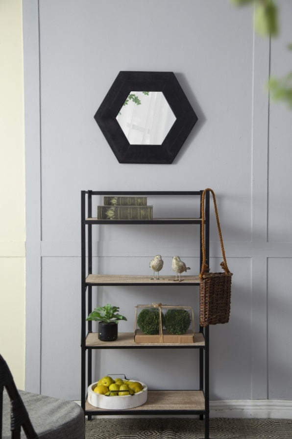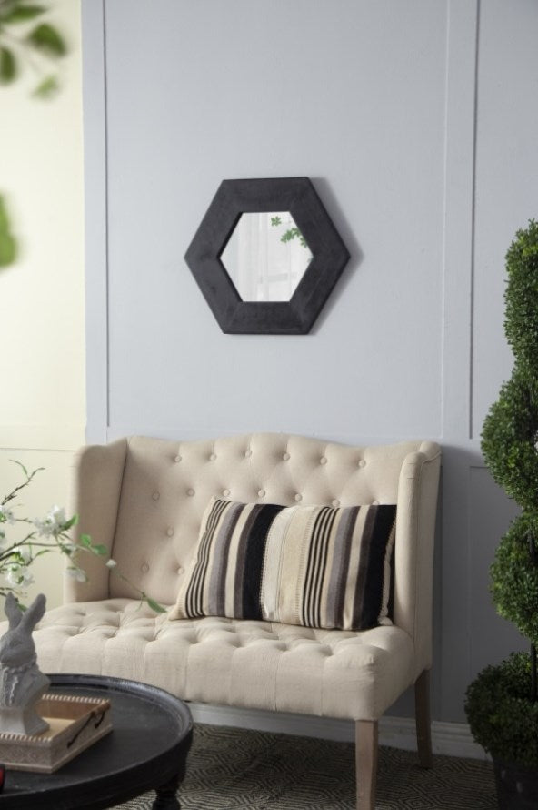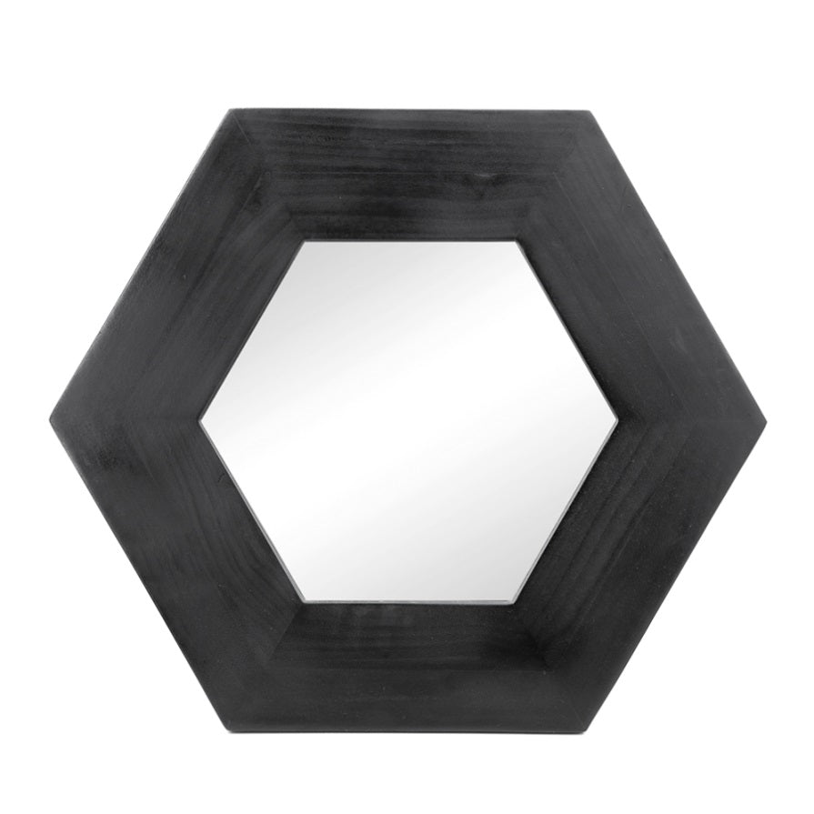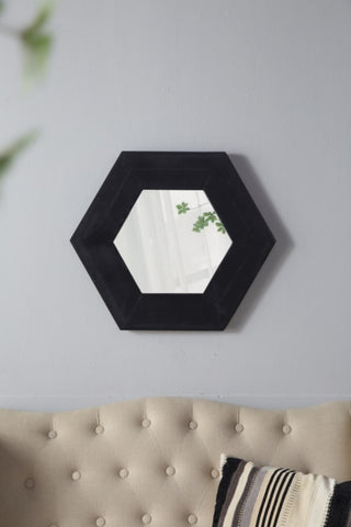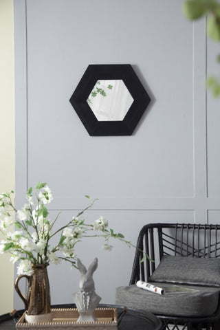 Add a glimmer of light with our Cameron Teak Wood Wall Mirror. This 18.5″ mirror is framed inside of a hexagon frame black toned teak wood. Fitting into a transitional decor style, the slightly smaller frame size of the mirror make the perfect accent to a gallery wall or add height to a floating shelf. Opening up a smaller room, watch as the light reflects off of the mirror, into the room.