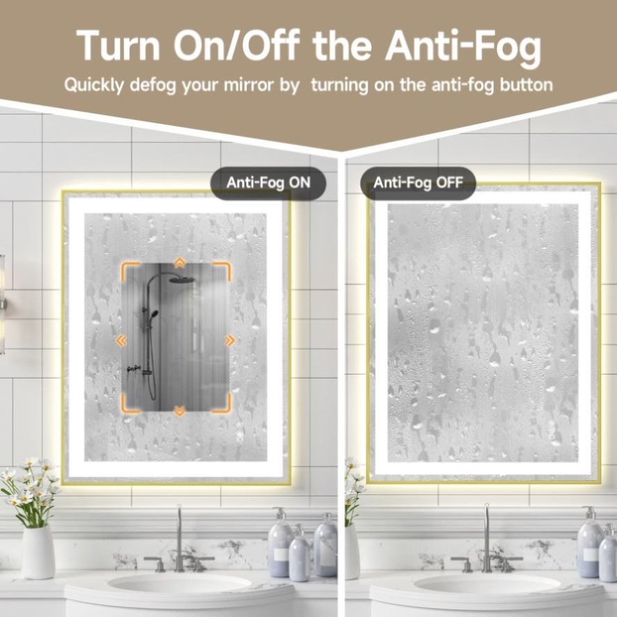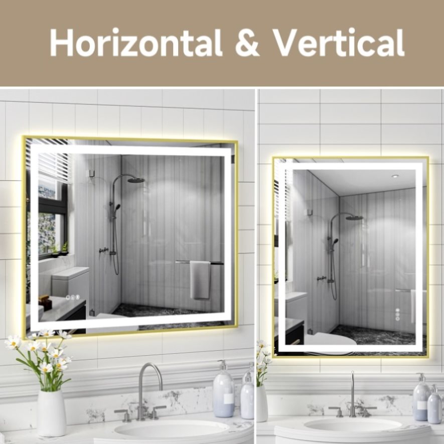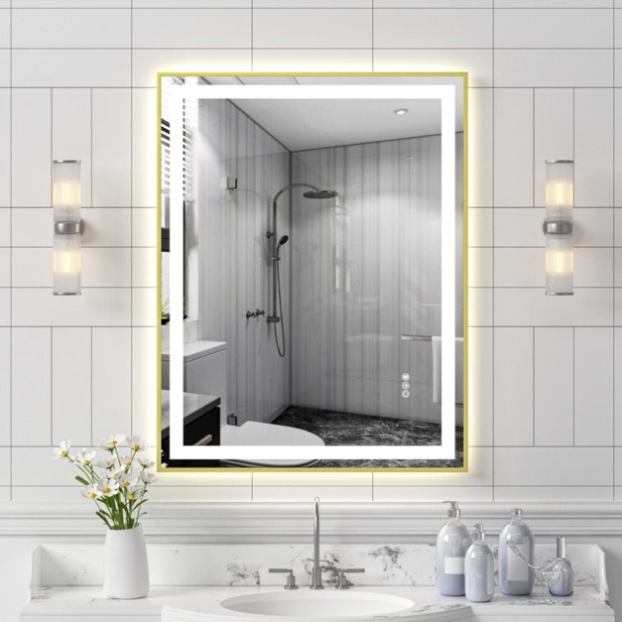 Stylish gold metal frame with front and back lighting for soft, ambient illumination—ideal for modern luxury bathrooms.