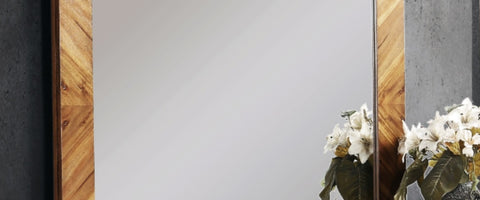 This 46 inch Mirror delivers an upscale look and chic, modern style. Constructed of select hardwoods and premium veneers, this mirror features a distinctive mitered wood grain sunburst pattern in a multi-tone Chestnut Finish. Whether placed in your entryway, bedroom, living room or bathroom, this showstopping mirror will make a sophisticated statement in your home. Fully assembled upon arrival, this piece is ready to unbox and enjoy.
