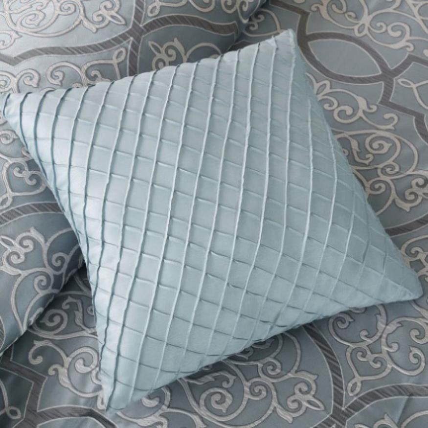 The Madison Park Lavine 12 Piece Bedding Collection gives your bedroom a rich and luxurious makeover. The comforter features a greyish blue jacquard woven fabric with a 3D effect created by a damask design in light and dark grey. The two pillow shams match the comforter design to enhance the luxury style. Two decorative pillows with embroidery and fabric manipulation details coordinate with the two euro shams for a stunning bedroom look. The set also comes with a complete ivory 100% cotton sheet set that adds a cozy touch to the bedding set. The items in the set may arrive in a rolled or compressed form, so you may need to fluff them up or steam iron them to smooth out any wrinkles.