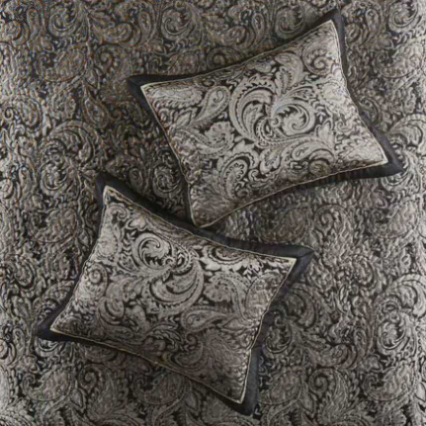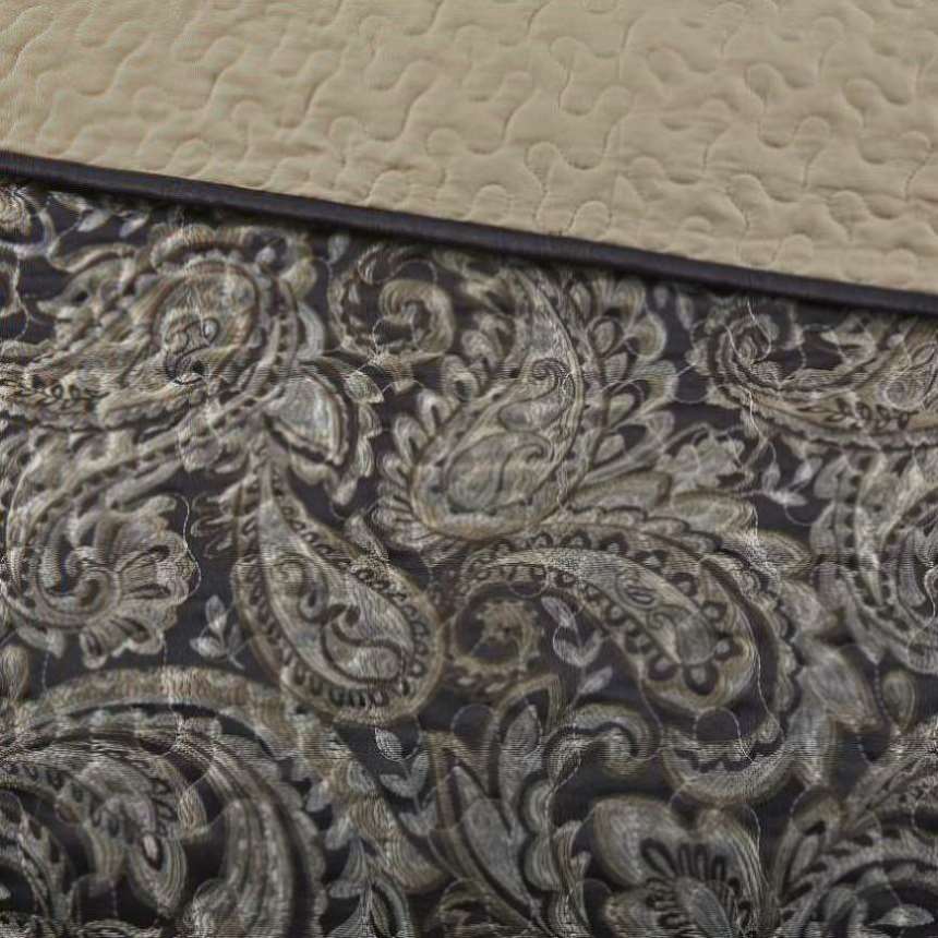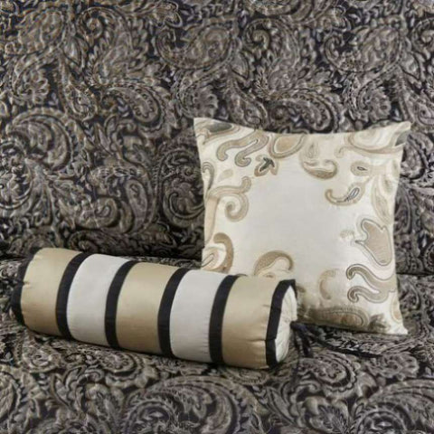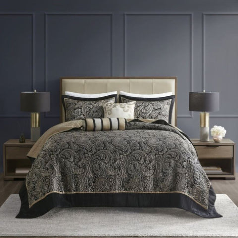 The Madison Park Aubrey 5 Piece Reversible Jacquard Bedspread Set provides a classic update for your bedroom. The jacquard weave is inspired from an updated paisley motif and is woven into a beautiful combination of deep black, gold, and a hint of platinum for a touch of sheen to your bedding. The quilted bedspread and shams offer beautiful details with a black flange and soft gold piping. The reverse is a rich taupe color, while two decorative pillows feature pleating and embroidery details that coordinate with the top of the bed to bring the entire look together.