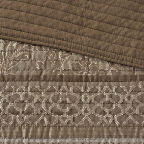 To add a touch of richness to your current decor, the Bellagio 6 Piece Reversible Quilt Set can update your room in seconds. Made from polyester jacquard, the quilt and shams share leaf, striping and ironwork motifs that are accentuated by ivory stitching on a chocolate brown base. Pops of gold are also used throughout this collection adding a lavish feeling to your decor. Three decorative pillows feature pleating and embroidery details that correspond back to the quilt to bring this entire look together.