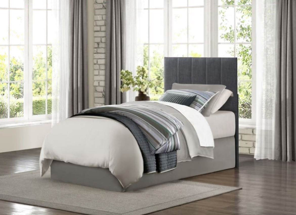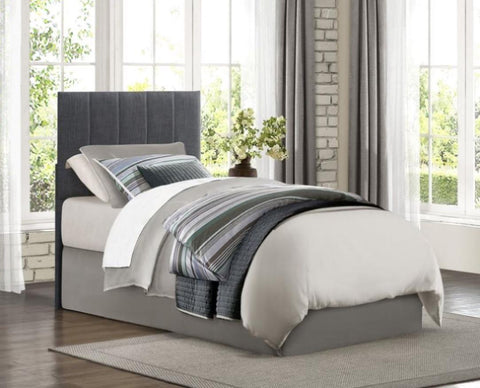 Gray fabric covers the padded vertical channel tufted twin headboard in the Potrero Collection. The streamlined profile was designed for maximum versatility of placement within your home’s decorative environment.