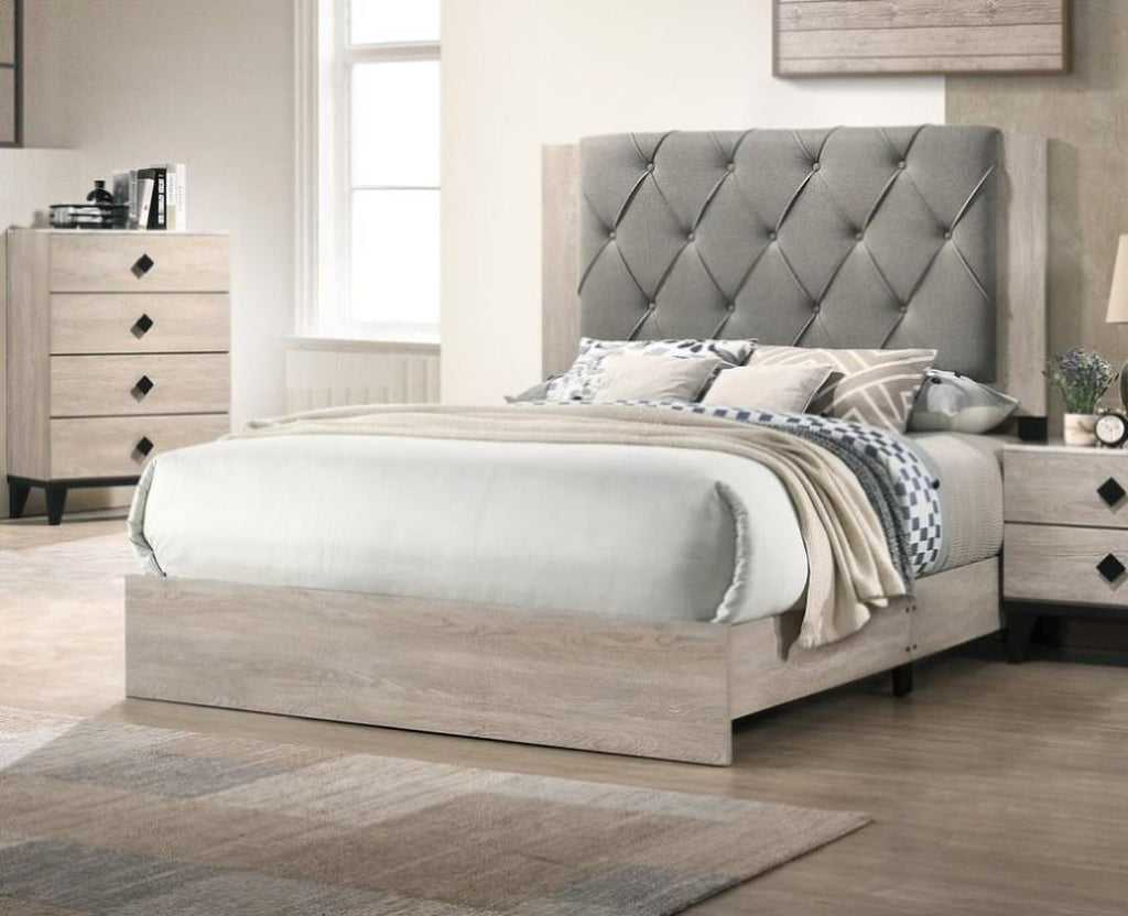 This complete and modern master bedroom set is a must have to match your minimal and chic style. Featuring cream finish rubberwood grey mix Upholstered Tufted cushion bed headboard create a soften look that fit any interior decor. The other pieces of this elegant collection elevates the whole room with their functional drawers and extended display to place. Eliminate the excess noise in your life with this simple and clean bedroom collection. The bed and matching storage pieces feature sleek, contemporary lines and a relaxed wood finish. It's perfect for a master or guest bedroom with a full range of bed sizes.With a bedroom that's this calm and collected, it's easy to reset at the end of each day.