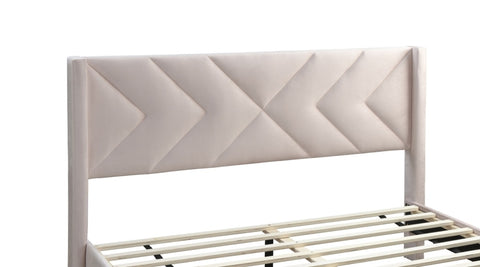 This bed combines style and functionality to create the perfect centerpiece for any Modern space. With its thoughtful construction and attention to detail, this Queen bed offers both comfort and style. It's an ideal choice for those looking to enhance their bedroom with a modern and practical piece of furniture. Designed with support legs and a robust platform base, this bed provides excellent stability without the need for a box spring. The footboard ensures a streamlined look, completing the bed's clean design. The headboard features a distinctive geometric stitched design, offering a modern flair that complements any decor. This unique design element adds visual interest and a touch of artistry to your bedroom. Available in neutral colors, the velvet upholstery brings a touch of softness and sophistication to your bedroom. The plush material adds a cozy feel, making it an inviting spot to relax and unwind.