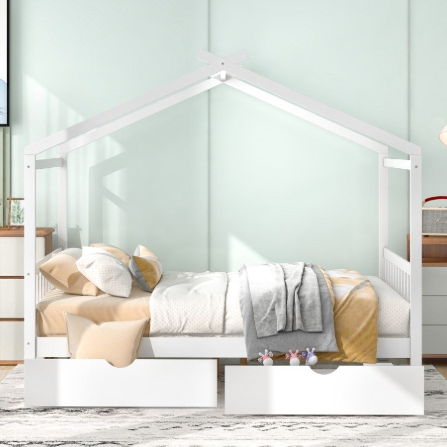 The funny house-shaped design adds charm and character to a your bedroom. A simple and interesting appearance gives your creativity free reign and you can decorate this bed with your little ones, giving full play to imagination. You'll love it for its low height that's easy to get in and out, so you don't have to worry about safety. Made of high-quality pine wood and MDF, the bed is durable and can keep serving you.The two large drawers under the bed offer you convenient storage space for daily necessities.