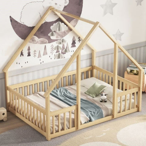 Full Wood House-Shaped Floor Bed with Fence, Guardrails