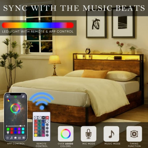 Modern Design with Customizable LED Lighting: Experience the perfect fusion of style and functionality with our rustic brown bed frame, complemented by stunning LED lighting. You can create the ideal ambiance to match your mood and style with a choice of 16 million colors and customizable settings via remote or app control. Adjust color temperature, and brightness, and even sync the lighting with music for a dynamic and immersive experience.