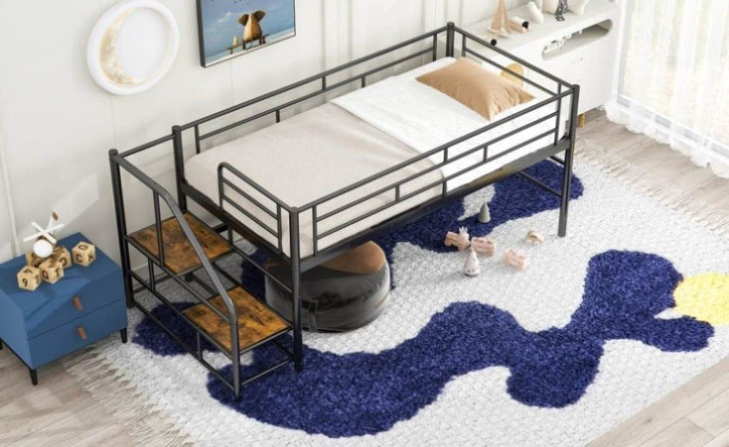 Create your child's bedroom with this loft, which has a ladder-style staircase to ensure your child's safety when going up and down. The bed slats are only 26.6" off the ground, so you don't have to worry about your child getting hurt accidentally. The sturdy metal frame is guaranteed to last for many years.