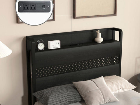 Storage Headboard with Charging Station 2 Standard Plug Outlets & 2 USB Ports with Cable Management 7.9ft long power supply cord. Make charging and common small items such as phones, glasses, and books within easy reach.