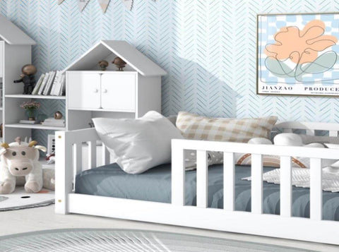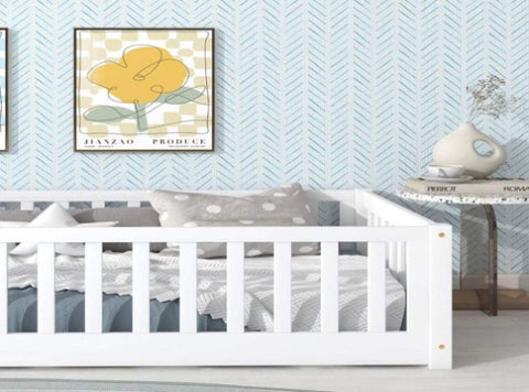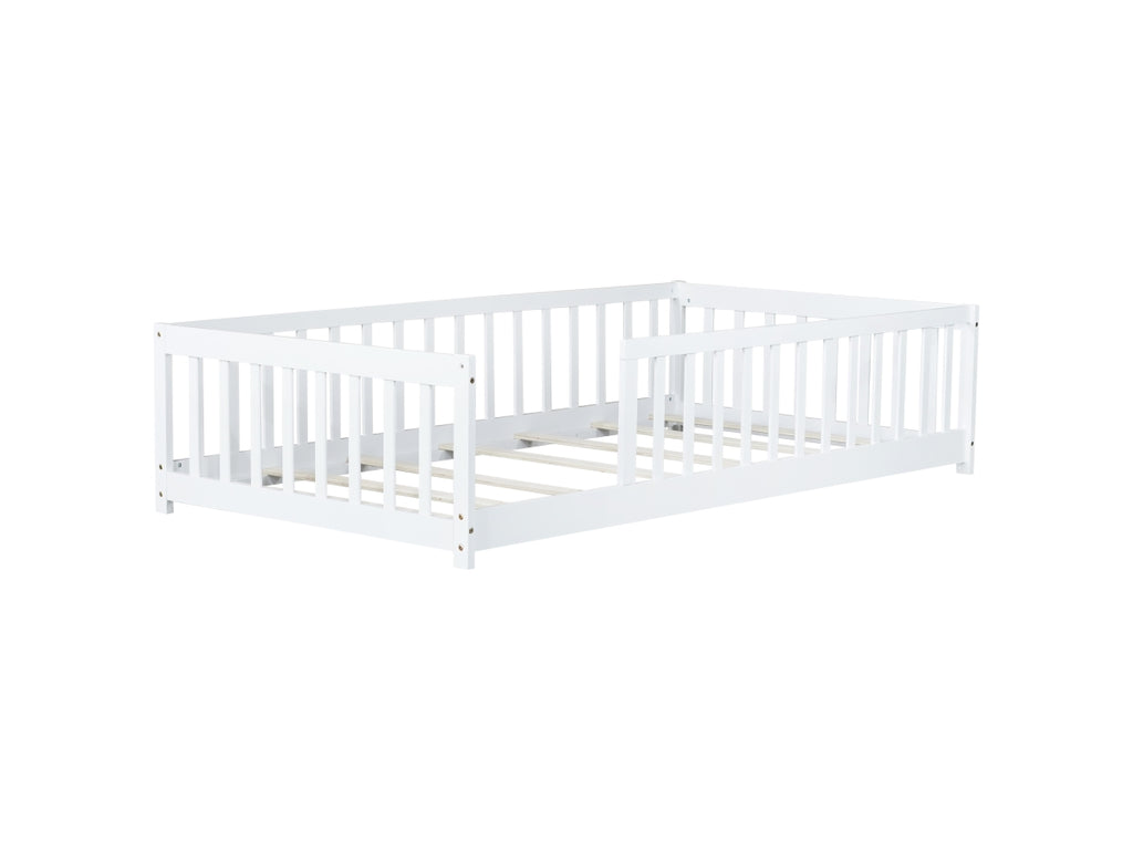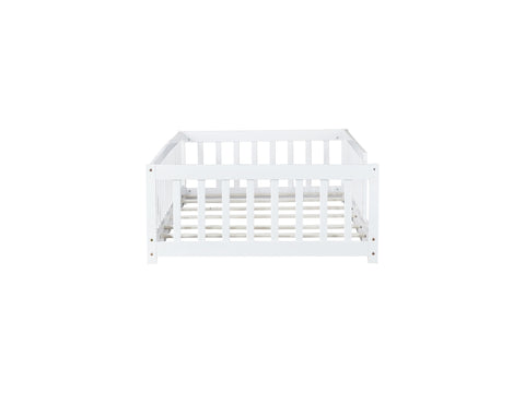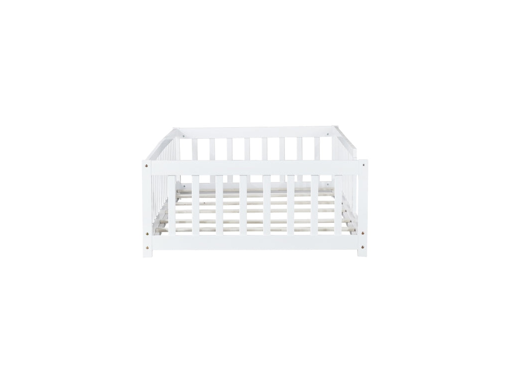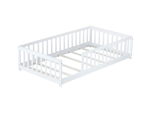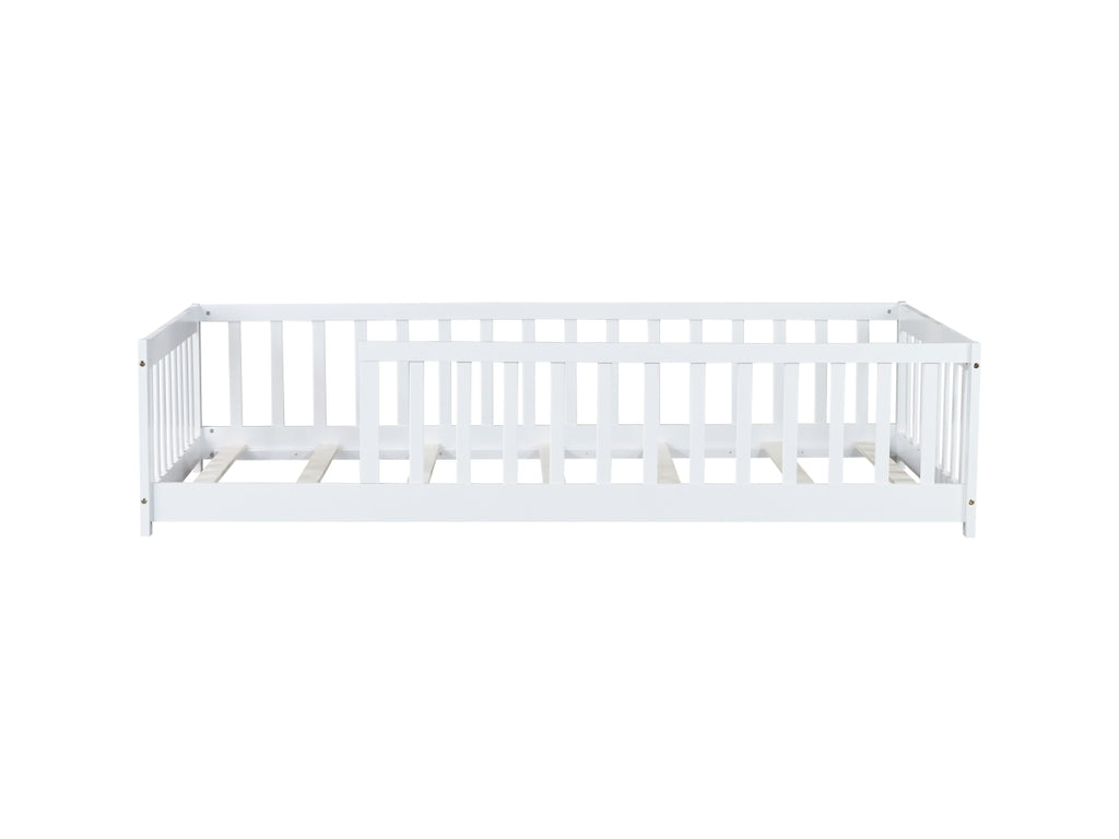 Twin Size Floor Bed with Fence without Door, Rubber Wood Floor Bed with Safety Guardrails,White W504P296795