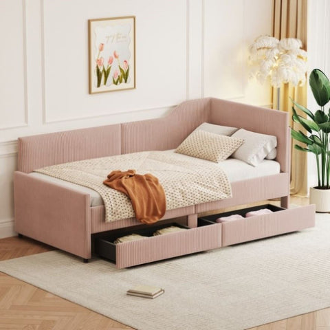 Twin Size L-Shaped Corduroy Daybed,Upholstered Bed Frame with 2 Storage Drawers,Pink N733P171470H
