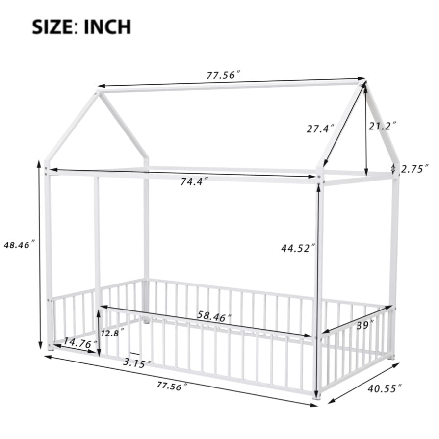 [Dimensions and Weight] Overall house bed dimension: 77.56"L x 40.55"W x 67"H. Product weight: 46.3 lbs. No weight limit. Mattress not included.