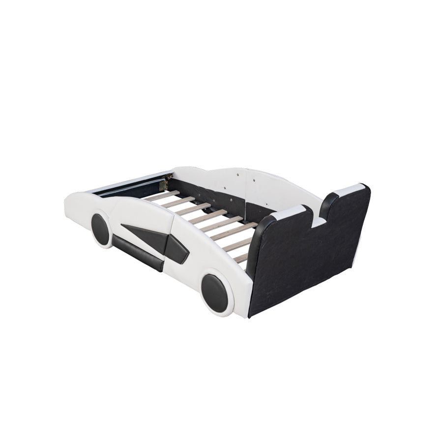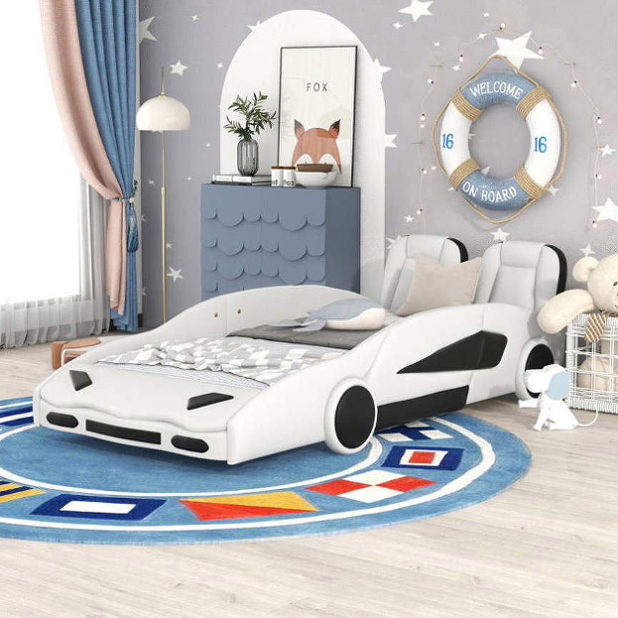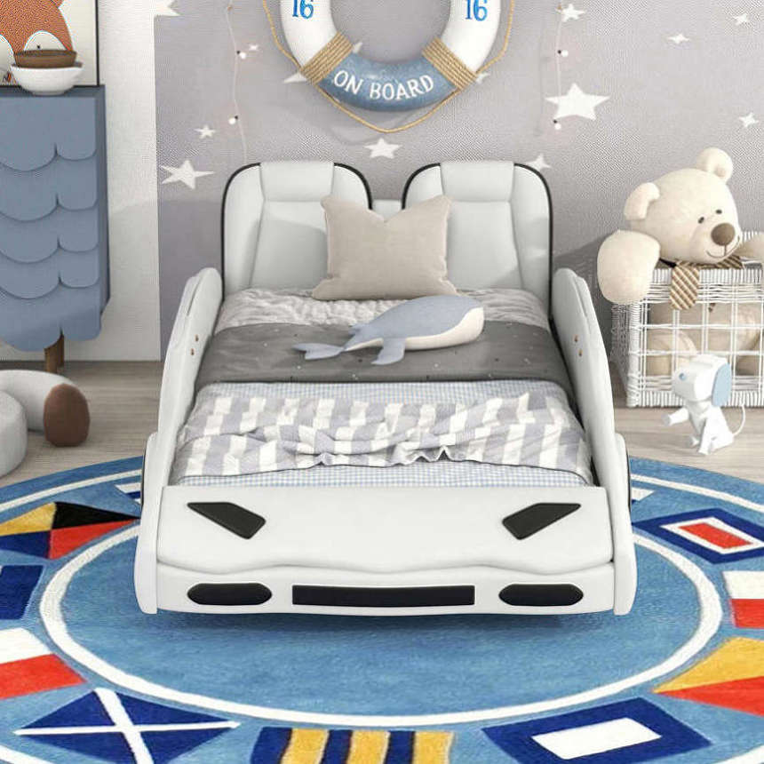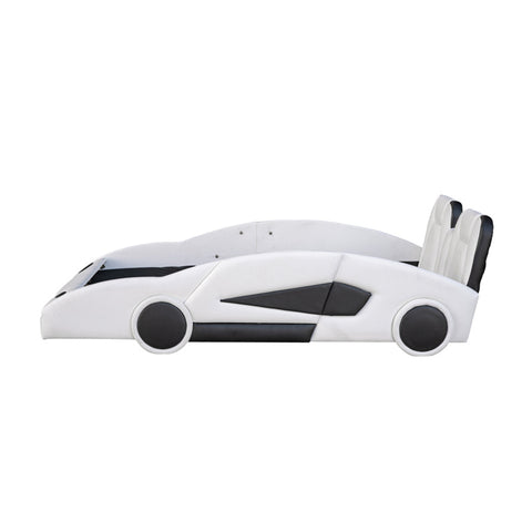 Twin Size Race Car-Shaped Platform Bed with Wheels, White