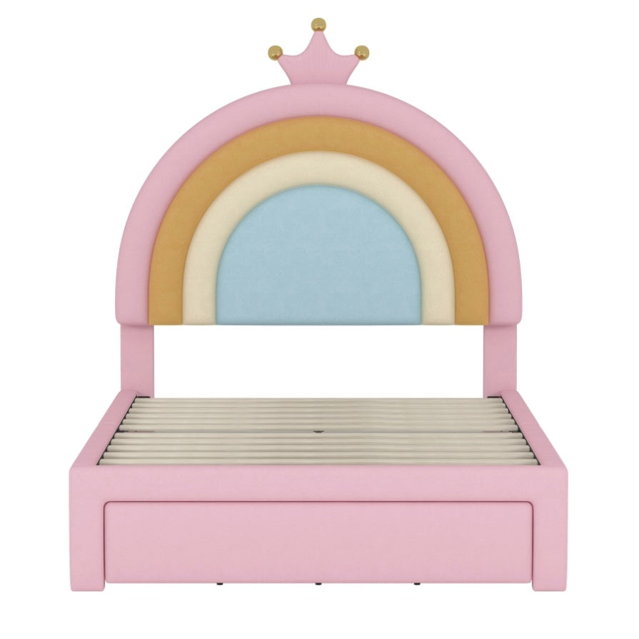 Bring color and functionality to your bedroom with the rainbow design bed. Featuring a vibrant rainbow design and soft velvet upholstery, it adds style and comfort to any space. The platform frame requires no box spring, while a built-in storage drawer keeps essentials neatly organized. Perfect for a bold and practical bedroom upgrade.