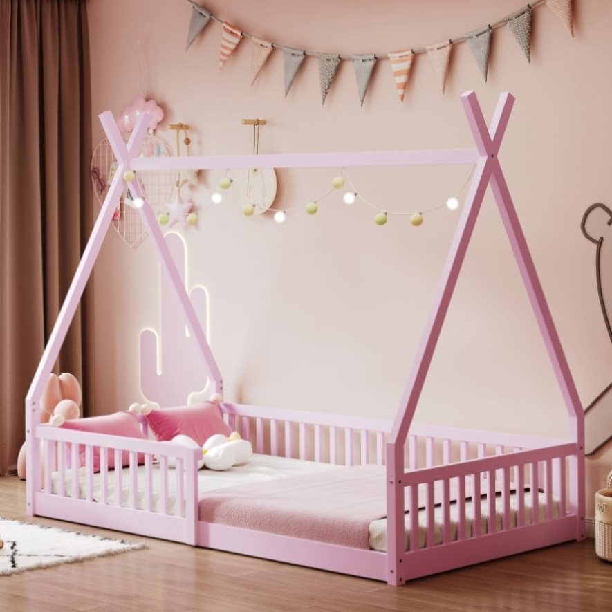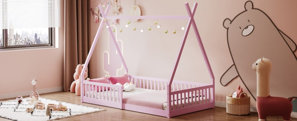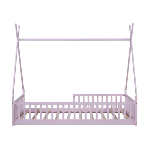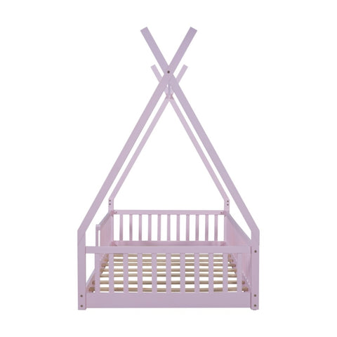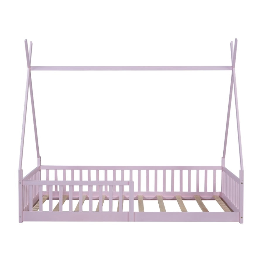 Twin Size Wood House Bed with Fence, Pink N709P183348H