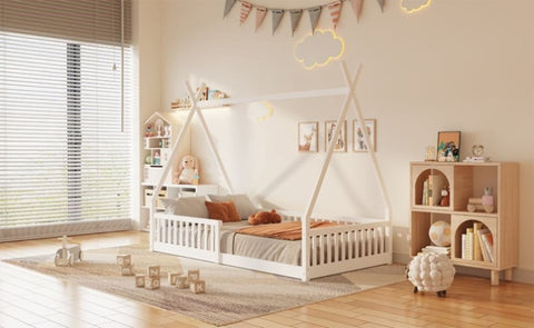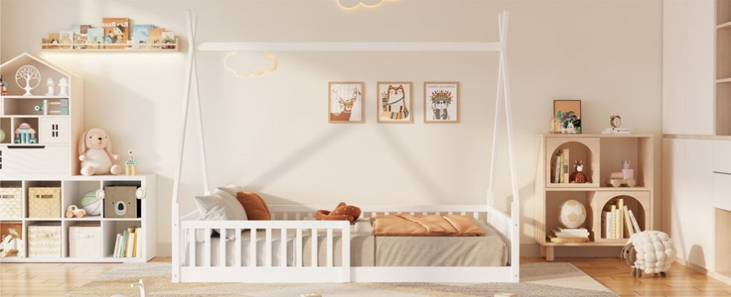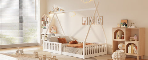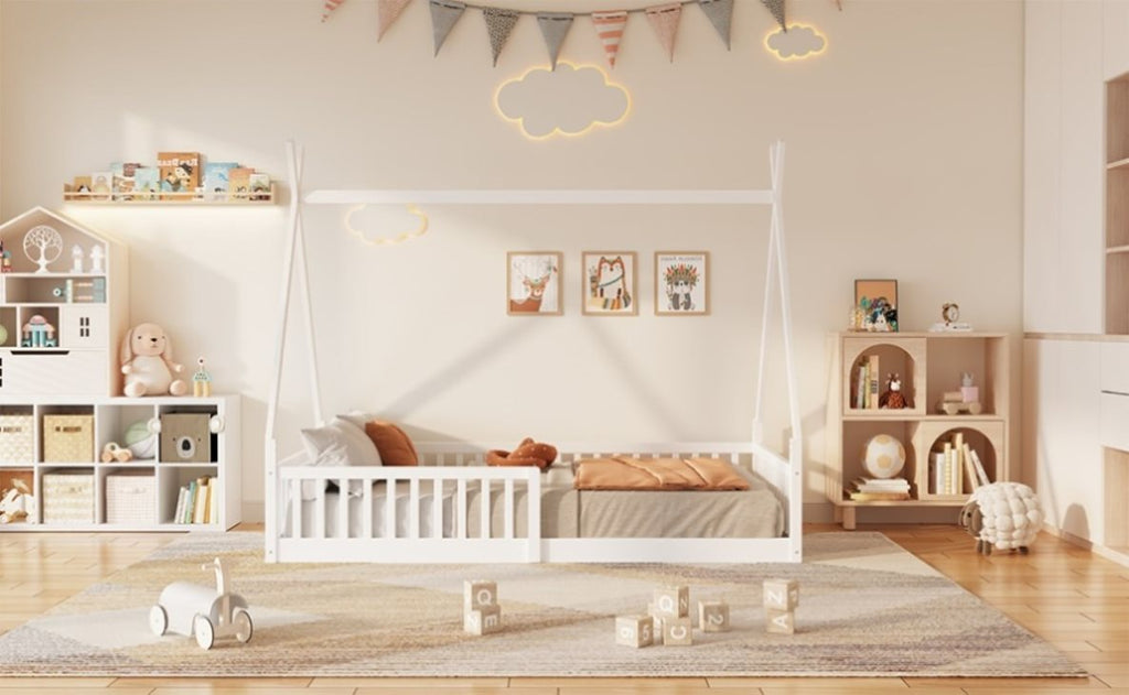 [House-Shaped Design] The house bed featuring a classic house-shaped, this imaginative bed is equipped with a whimsical sky roof and uniquely shaped guardrail for a fun bedroom environment that your child will love.