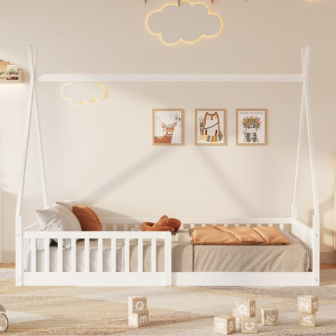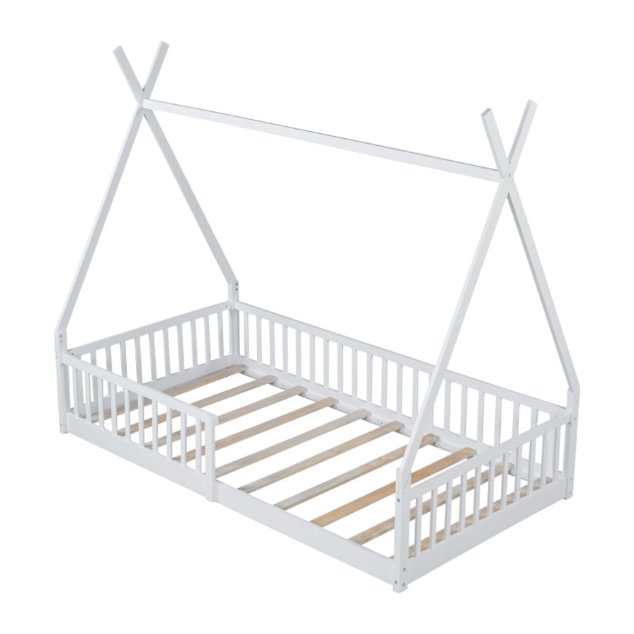 Twin Size Wood House Bed with Fence, White N709P183348K