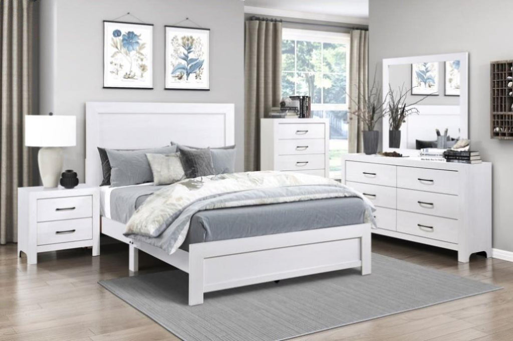 Modern lines and rustic styling are paired to create the look of the Corbin Collection. The 3D printed paper veneer’s texture is highlighted by a white finish for a realistic wood look. Subtle framing defines the profile of the queen panel headboard and footboard, further lending to the unfettered design of the collection. The bed’s construction allows for convenient packaging within one box.