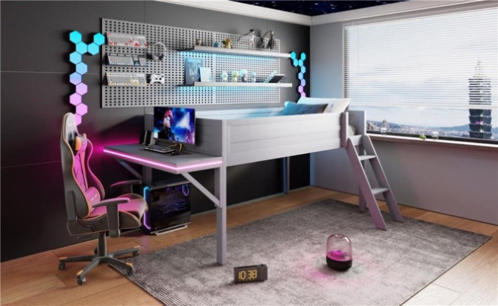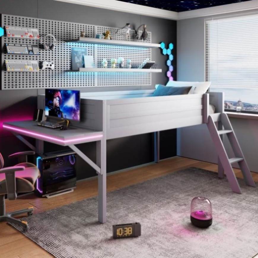 Craft your gaming den with this loft Gaming Bed, a single mid loft bed with integrated desk to storage for consoles, gaming accessories and PC hardware. Ideal of younger gamers, this gaming bed is raised on a sturdy wood platform which provides plenty of under-bed storage space for extra furniture, toys or gaming chairs.