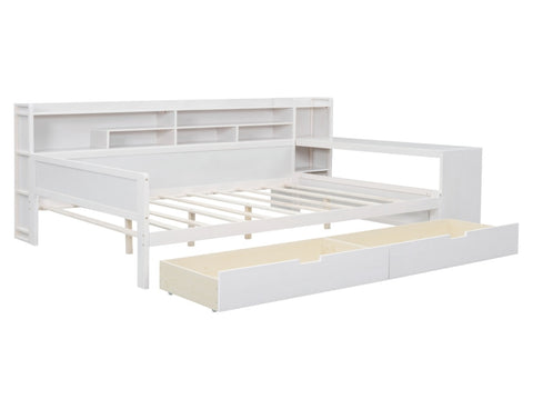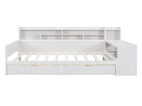 Wooden Daybed with Storage Shelves, Multi-functional Bed with Two Storage Drawers and Study Desk