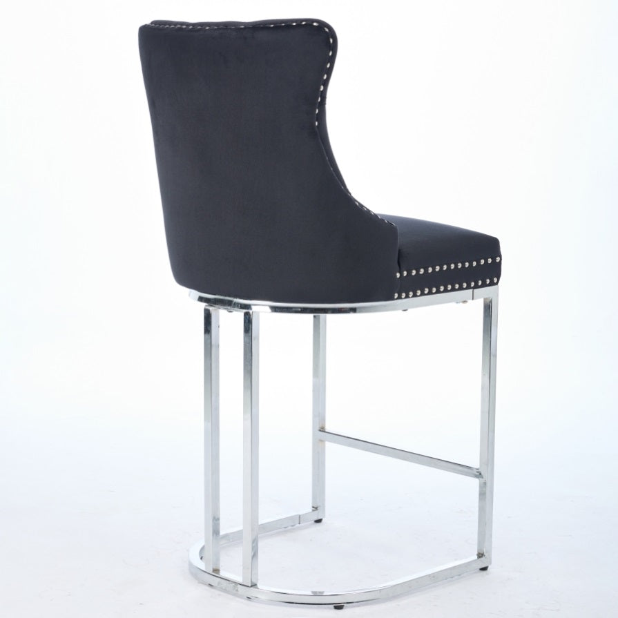 This Velvet Chrome Bar stools featuring a very modern mid-century look,numbers of decorative rivets are inlaid around the cushion and backrest, which looks more noble and elegant. The high back with deep button tufted design gives the whole chair a delicate and luxurious feel.