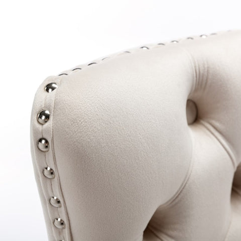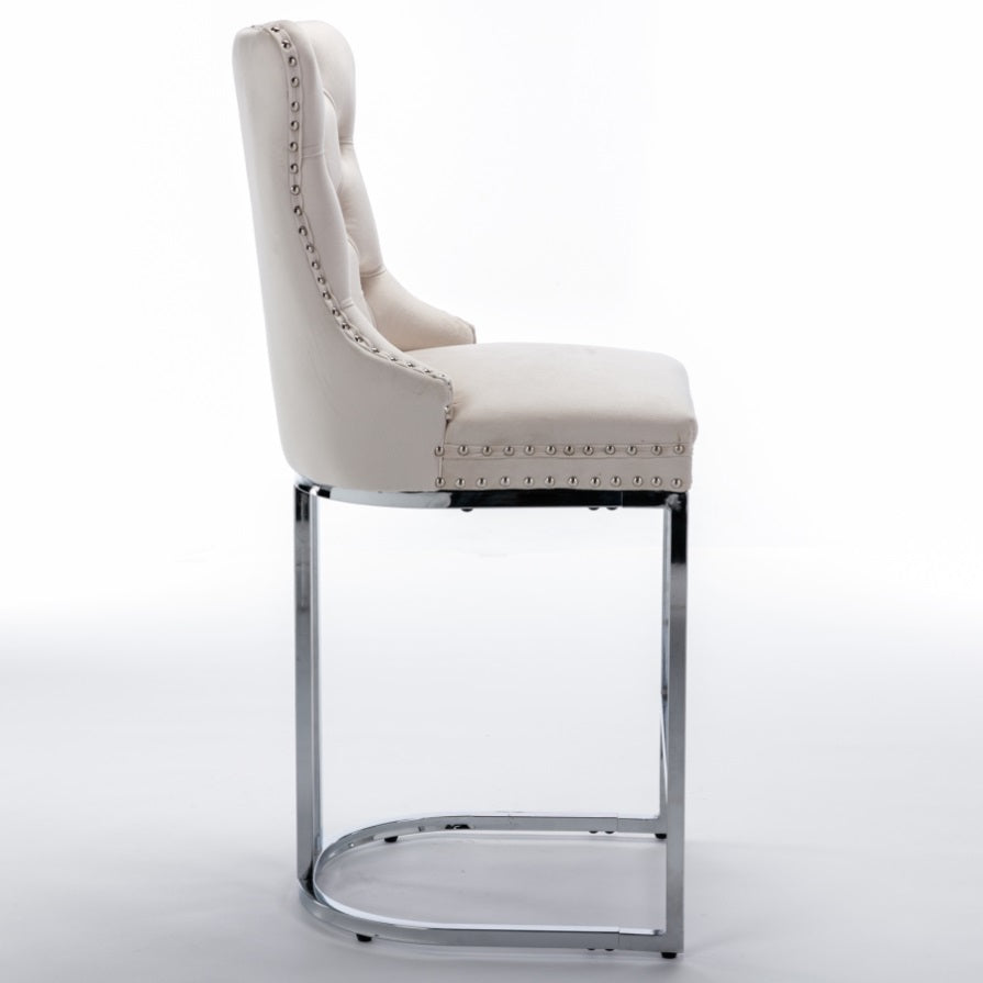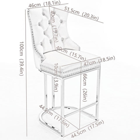 This Velvet Chrome Bar stools featuring a very modern mid-century look,numbers of decorative rivets are inlaid around the cushion and backrest, which looks more noble and elegant. The high back with deep button tufted design gives the whole chair a delicate and luxurious feel.