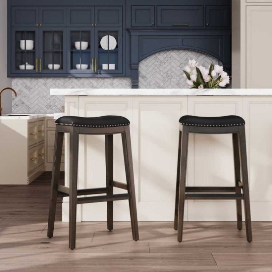 STYLISH: These comfortable and classy stools are sure to add style to your kitchen or dining space. The premium bonded leather seat with complementing hand-tacked nail head trim and beautiful finish complete the refined design of this classic stool.