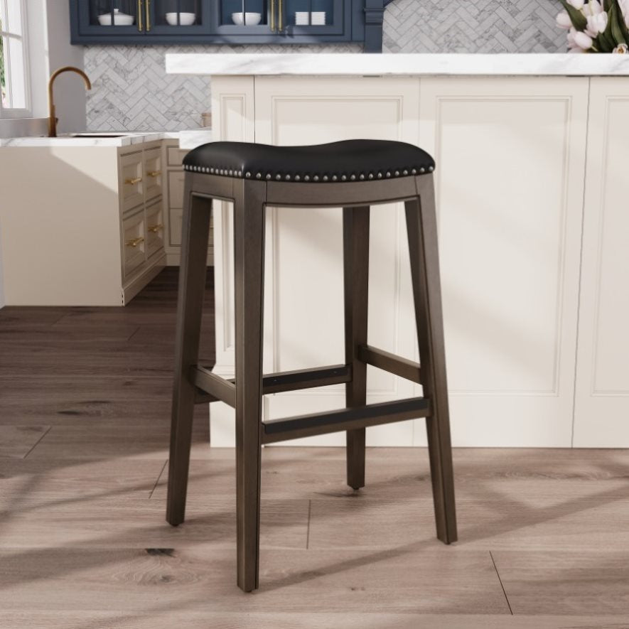 30" Bar Height Saddle Stool, Weathered Gray Finish, Black Leather Seat B046109807