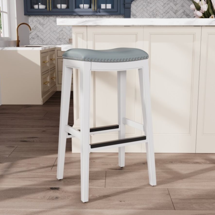 The subtly contoured seat and timeless design make this stool an enjoyable spot to linger. These stools are built to last with a solid hardwood frame, metal foot plates to protect the stool from footwear damage and a bonded leather seat. This stool is available in two sizes and five finishes. The padded saddle seat is upholstered in bonded leather with complementing nail head trim. The simple yet elegant design and color palette make it easy complement any kitchen or dining décor.