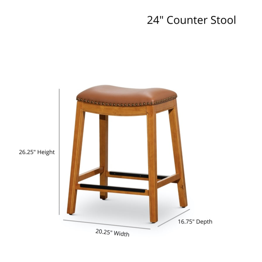 The subtly contoured seat and timeless design make this stool an enjoyable spot to linger. These stools are built to last with a solid hardwood frame, metal foot plates to protect the stool from footwear damage and a bonded leather seat. This stool is available in two sizes and five finishes. The padded saddle seat is upholstered in bonded leather with complementing nail head trim. The simple yet elegant design and color palette make it easy complement any kitchen or dining décor.