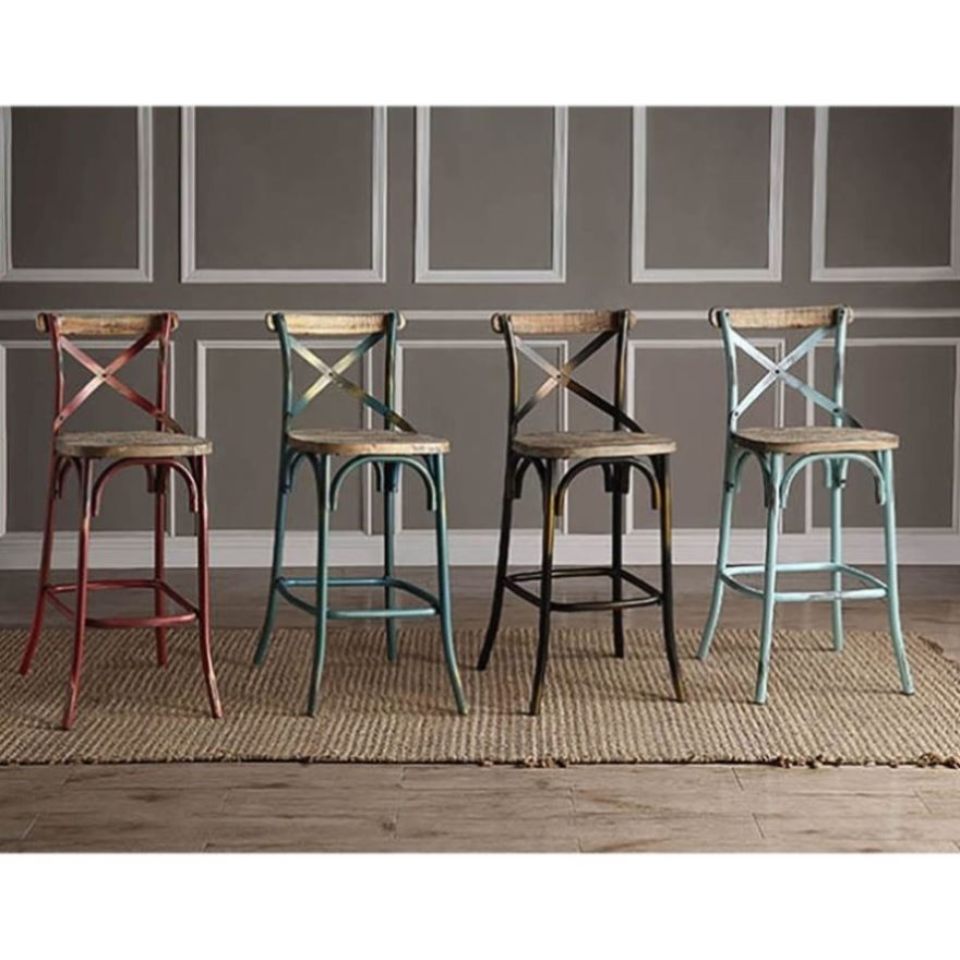 This vintage-style bar stool features a high backrest for enhanced support and comfort, making it ideal for long seating periods. Crafted with a warm wooden seat and a sturdy four-legged base with footrest support, it brings classic charm and stability to your bar or kitchen counter area.