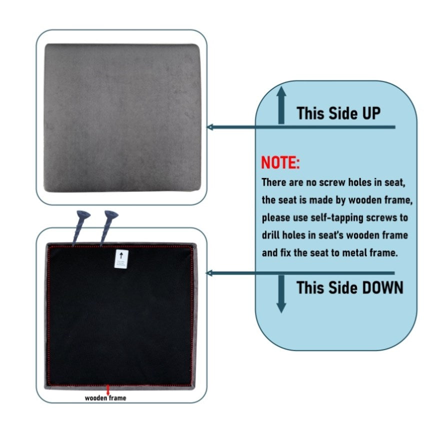 NOTE: No screw holes in seat; wooden frame requires self-tapping screws to be drilled for installation onto the metal frame.