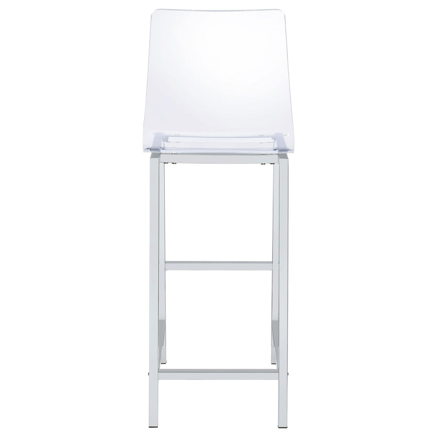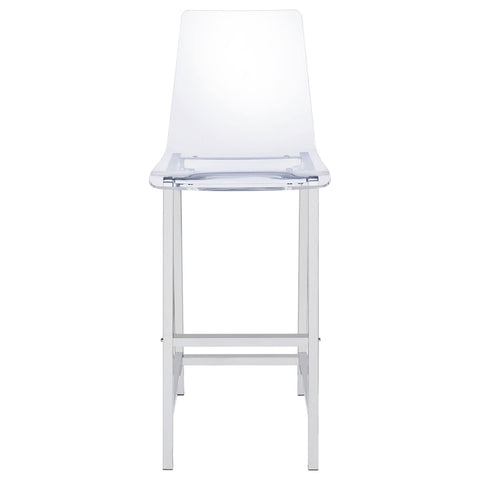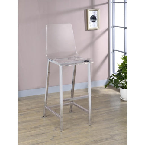 Crafted with a robust chrome base, this contemporary stool showcases a clear acrylic body, exuding modern elegance. The stool's sleek, curved back ensures both simplicity and comfort, inviting your friends to relax in style.