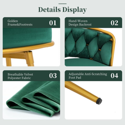 Highlights Metal Frame // 180° Swivel Seat // Golden Frame&Footrests //Breathable Velvet Polyester Fabric // Foam-Filled // 31.5inch Counter Height // Set of 2 //Hand-Woven Design Backrest//Low Back // Upholstered Bucket Style Seat// Adjustable Anti-Scratching Foot Pad // For Kitchen&Dining // 286.6lbs Weight Capcaity // Easy to Installation (10min/pc/person) // Optional 4 Colors