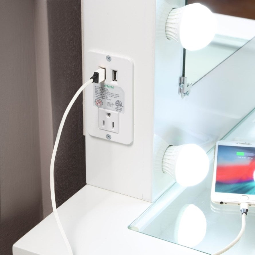 Elevate your daily beauty routine with our Makeup Vanity in pristine white. This versatile and elegant piece is designed to enhance your space while providing the functionality you need. Equipped with 10 lights for optimal illumination, a built-in USB and power outlet for convenient charging, and a comfortable matching stool, this makeup vanity is a must-have addition to your bedroom or dressing area. The sleek white finish adds a touch of modern sophistication, while the spacious drawers offer ample storage for your beauty essentials. Experience the perfect blend of style and practicality with our Makeup Vanity, designed to make your beauty rituals a truly enjoyable and luxurious experience. PRODUCT DIMENSIONS: Overall Dimension: TABLE: 31.5" x 20" x 53"H STOOL: 18" x 12" x 18"H Listing Includes: Makeup Vanity and Stool Set Simple Assembly Require.
