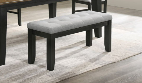 Product Description: This bench adds great seating to complement the rectangular dining table. The tufted upholstery seat with the look of linen fabric adds chic sophistication to this contemporary-style bench with solid wood and veneer made.
