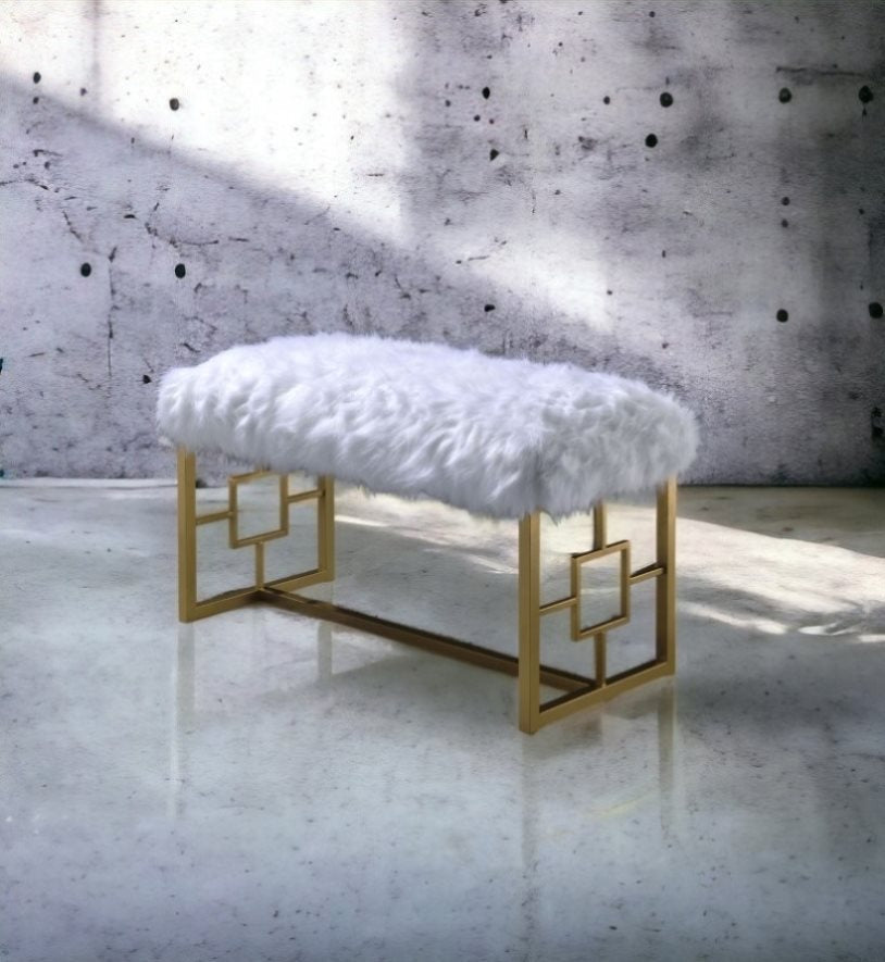 Armless Lounge Bench (Backless), NO Storage, Padded Seat: White Faux Fur, Tight Seat Cushion, Metal Base: Gold Finish