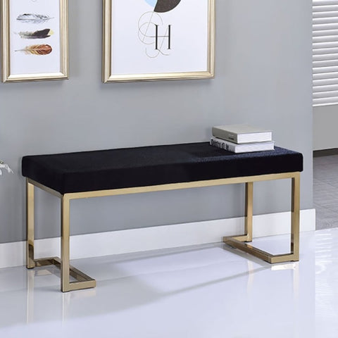 This sleek bench showcases a minimalist design with a cushioned, black upholstered seat atop a champagne finish metal base, offering both comfort and style. Its open return base and simple rectangular form highlight the collection's elegant and minimalist aesthetic, perfect for modern interiors.